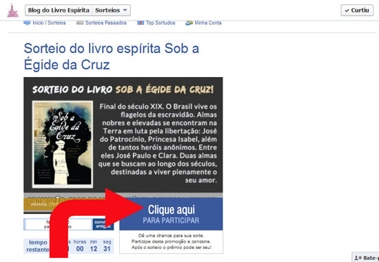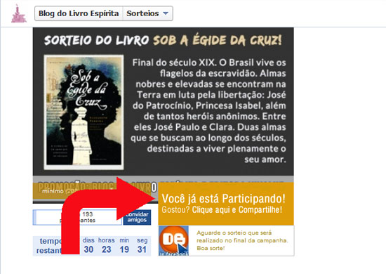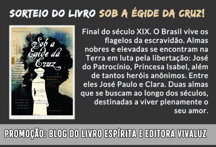 Olá amigos! Temos uma promoção em nossa página do Facebook! Em parceria com a Editora Espírita VivaLuz, estamos sorteando o livro Sob a Égide da Cruz, super lançamento psicografado por Elizabeth Pereira pelos espíritos Sophie e Cristóvão. Para ler o resumo deste lindo romance, clique aqui.
