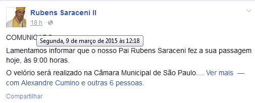 Segundo consta nesta publicação, Pai Rubens faleceu em decorrência de um câncer ocasionado pelo uso de tabaco.