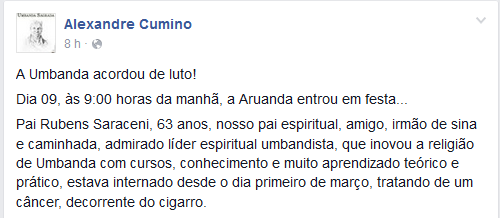 | Nota de falecimento e homenagem da fan page “Umbanda, eu curto” |