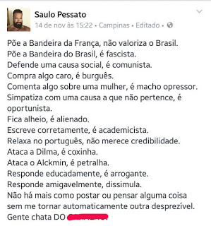 Vejamos o recente caso que deixou as redes sociais em polvorosa. Primeiramente tivemos a tragédia em Mariana, que matou pessoas e um rio inteiro. Depois os atentados em Paris. O Facebook, gentilmente, criou um aplicativo que permitia colocar a bandeira da França nas fotos de perfil dos usuários desta rede social, como forma de mostrar solidariedade ao povo francês. Pra que, né? Muita, mas muita gente se revoltou alegando que a tragédia de Minas era mais importante do que a da França. Amigos, por um acaso existe tragédia mais ou menos importante? A meu ver as duas tragédias mereciam nossa atenção e, principalmente, nossas preces.