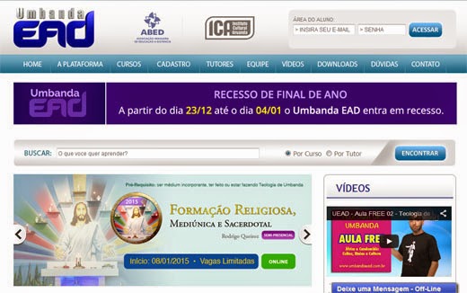 Idealizada por Rodrigo Queiroz, a plataforma Umbanda EAD conta com vários cursos online, alguns já bem famosos no meio umbandista, como o Teologia de Umbanda Sagrada que tem duração de 1 ano e é ministrado por Alexandre Cumino e o Rituais com Ervas, do erveiro Adriano Camargo.